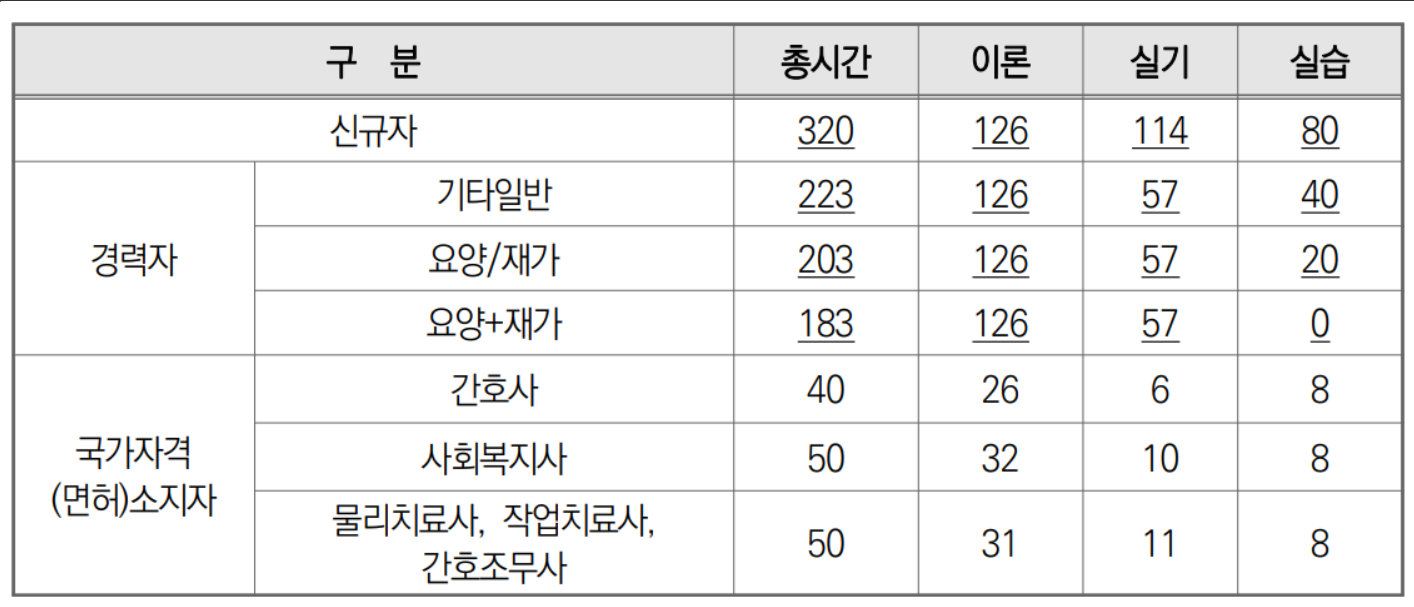 요양보호사 교육은 총 320시간으로 구성되어 있으며, 이론 126시간, 실기 114시간, 실습 80시간으로 이루어집니다. 2024년부터는 치매 전문 교육이 추가되어 총 교육 시간이 증가하였습니다.